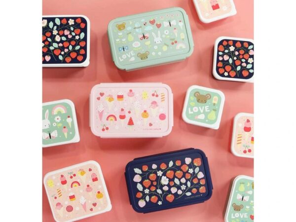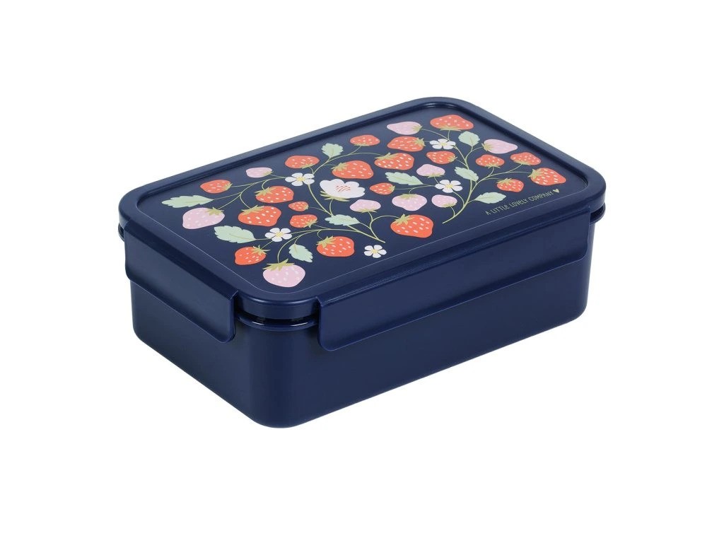 Tento praktický svačinový box s jahodovým designem se stane perfektním společníkem dětí do školy nebo na výlety.